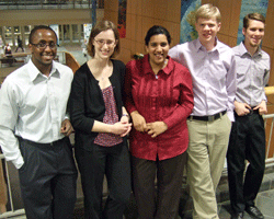 | St. Olaf senior mathematics majors (L-R) Ian Gacheru, Deidre Kiefer, Briana Griffin, Bryant Torkelson, and Jonathan Woolums spent January creating a model for transportation analysis that has grabbed the attention of the U.S. Department of Transportation. |