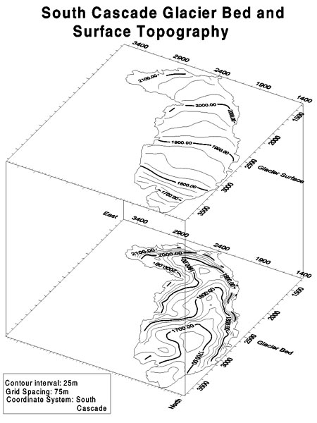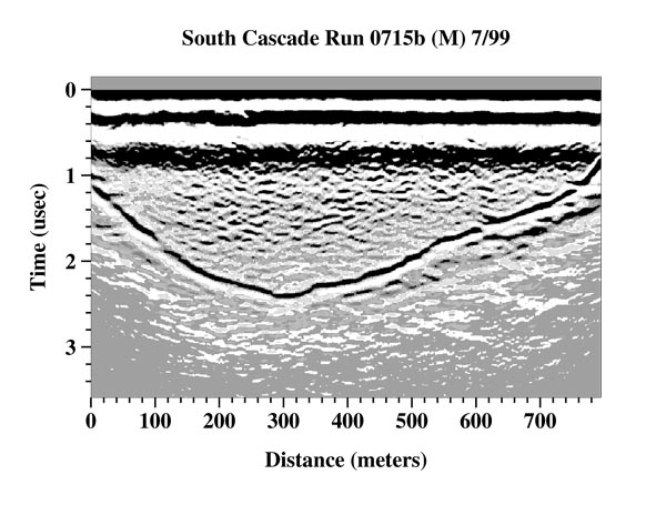Trials of the radar system improvements in each year have been carried out in conjunction with ongoing work on South Cascade in collaboration with the USGS to map the bedrock and radar brightness as an indication of the presence of water. In the early 1990's we conducted profiles in the upper basin of South Cascade to complete the mapping project. In 1994 we used the radar to make a detailed map of the bed as part of the site selection process for a core to bedrock drilled by the USGS. At this point, the radar data have been processed and we have produced maps of ice thickness and bed topography for the entire glacier.