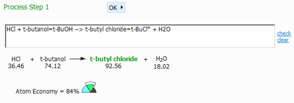I emphasize theoretically here because atom economy is based entirely on just knowing the balanced chemical equation (the theoretical stoichiometry) for a chemical reaction, not anything about any actual reaction details, such as amount of reactants, limiting reactants, side reactions, etc. Early on in our design for the Green Chemistry Assistant, we decided that the site should help students understand what atom economy is about, but that should not be the focus. That is, the site should not itself be a virtual workbook for learning how to calculate atom economy. (That would be a different tool.) So when a student enters a balanced equation, the atom economy is instantly calculated (Figure 1).
