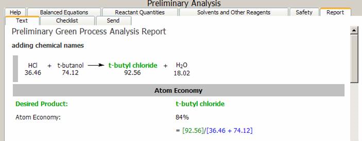 a valid equation is entered, atom economy is calculated immediately. Note that the report produced by the GCA does detail the method of calculation (Figure 2) for atom economy.