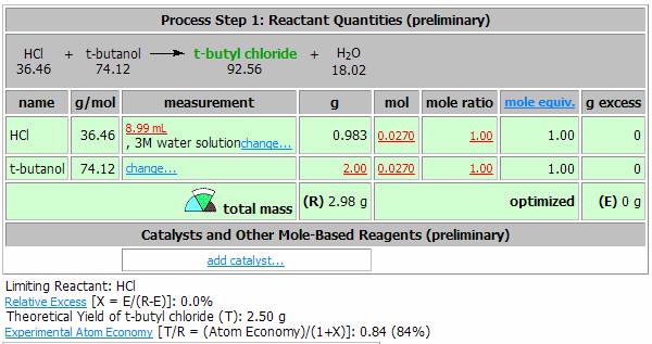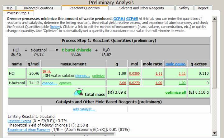 Note that since any excess reactant mass is in the denominator here, the experimental atom economy is at most the atom economy and more likely will be somewhat lower. Catalysts and Reaction Optimization It is at this stage in the green chemistry analysis that we consider catalysts and other mole-based reagents needed for the chemical reaction, although they do not figure into the calculation yet. We do this because the sorts of calculations involved (determining molar masses, calculating molar ratios) are more similar to what is done for reactants than what will be done for solvents.