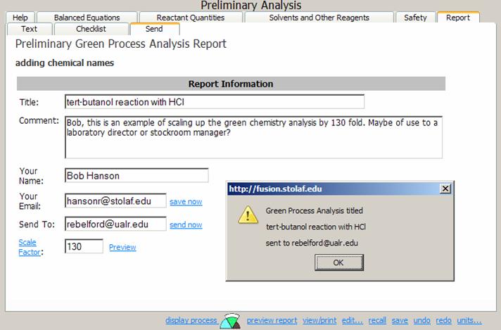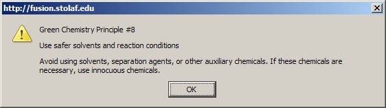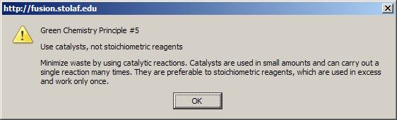 final report page details how the atom economy was calculated. We debated at length whether it was wise to "tell all" in this regard. Shouldn't students be required to demonstrate that they know how to calculate the atom economy themselves? The answer we arrived at was this: Absolutely. Just not here. We can save that for the exam. We'll get back to this issue below, in the section on what we've learned about our students. What the Green Chemistry Assistant emphasizes is that atom economy is just one simple example of the much richer variety of green chemistry measures that can be discussed in relation to a chemical process. After all, the balanced chemical equation is only a beginning. Balanced Chemical Equations and Intentionality In organizing the information flow of the Green Chemistry