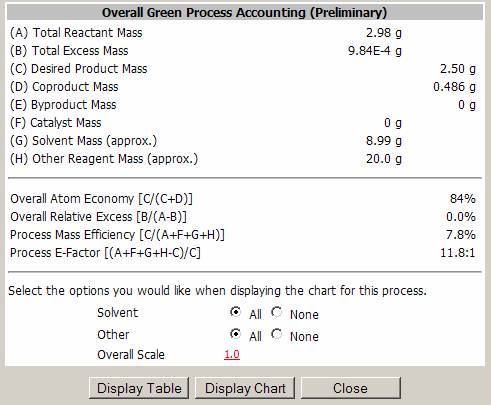 I'll finish up with one creative use of the Green Chemistry Assistant that could potentially help any laboratory manager. This is the Assistant's capability to produce "scaled up" reports (which are E-mailed to the user for safekeeping). If one generates a report for some lab process that the students are doing and then scales it up by the number of students in organic chemistry, one can quickly see the expected material and waste issues (Figures 7 and 8).