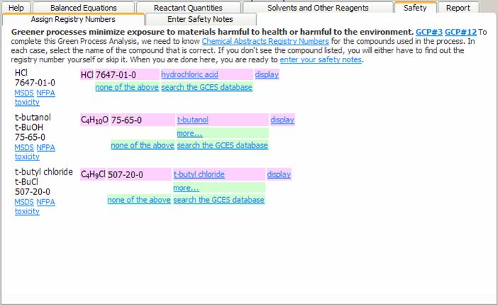 Bringing to students a responsible awareness of chemical safety and waste management issues has probably been the most valuable aspect of bringing green chemistry into the undergraduate curriculum. This, then, is our connection to the United States Environmental Protection Agency. The Green Chemistry Assistant can tap into an EPA database of over 60,000 compounds, providing access to registry numbers, as well as toxicity and general chemical hazard information (Figure 6).