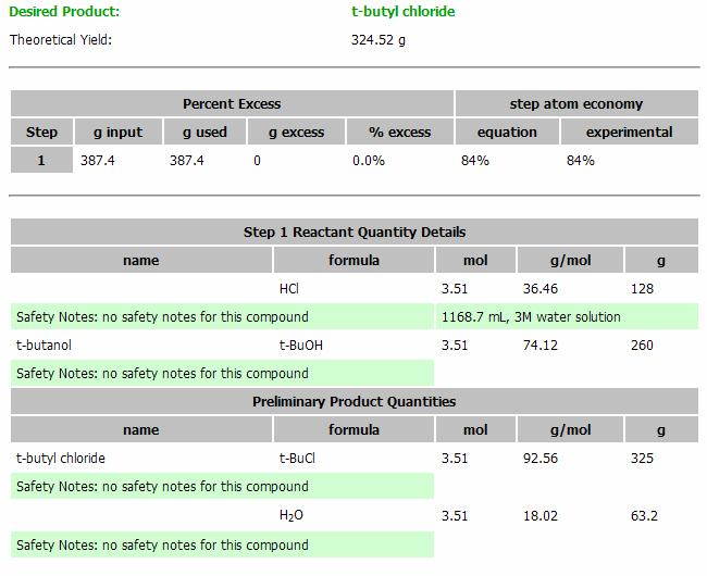 In addition, it is at the reaction consideration stage that we might start to think about how we might optimize the reaction. Here the Green Chemistry Assistant can do some pretty fine magic. Want to know how much HCl is "just enough"? Click on "optimize" there and see what happens (Figure 4). Now we have no relative excess, and the experimental atom economy is a bit higher. It looks like we might be able to get away with using only 9 mL of 3 M HCl solution instead of 10 mL. (Of course, that brings up other considerations, doesn't it?)
