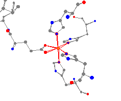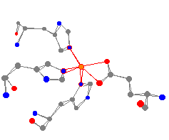 As can be seen from this view of the protein, the iron is bonded to three histidine groups (in the usual manner through a nitrogen in the ring) and one glutamic acid carboxylate. This iron center has a fairly distorted square pyramidal geometry. The average N-Fe bond is 219 pm and the two oxygen atoms are at 185 and 214 pm.2