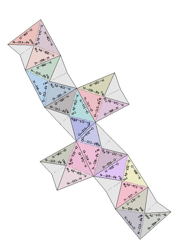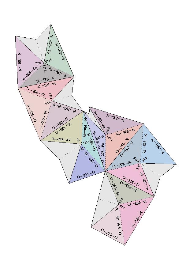 As can be seen in the view, the iron is surrounded by four histidine molecules and one glutamic acid. The geometry of this iron is different from the iron in transferase because of the larger number of histidines, and could best be described as a distorted octahedron.3 Again, valuable information could be obtained by comparing the angles and distances of the bonds from the iron to the two atoms in the glutamic acid. The axial nitrogens are at an average of 232 pm, while the equatorial nitrogens have an average distance of 214 pm. The oxygens are 212 and 215 pm from the iron atom. The iron-ligand bond distances are slightly longer than the above transferase. This can be explained, as the extra histidine in 1aig should lead to a higher electron density around the iron, and an overall more shielded iron center.