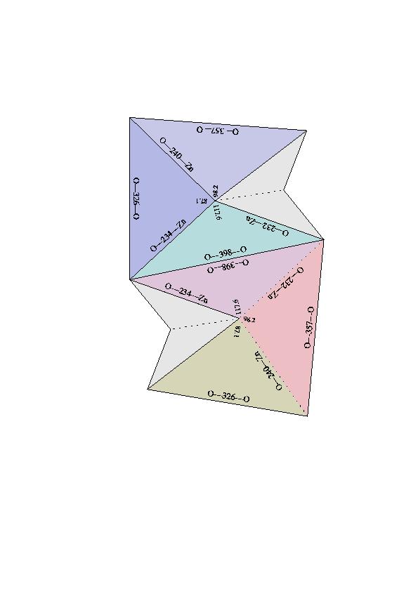 Fructose-1,6-bisphosphatase is a key regulatory enzyme in gluconeogenesis. This important enzyme catalyzes the hydrolysis of D-fructose-1,6-bisphosphate to D-fructose-6-phosphate. It is regulated by two inhibitors: AMP and fructose-2,6-bisphosphate. Fructose-1,6-bisphosphatase is activated by divalent metal ions in low concentrations. High concentrations make it less active.1 This zinc center has three oxygen atoms attached to it from a glutamic acid, an aspartic acid, and 2,5-anhydroglucitol-1,6-biphosphate. The average bond length is 235 pm. This center is less planar than the other two centers on the page, with the average angle at the peak of the pyramid being 101°.