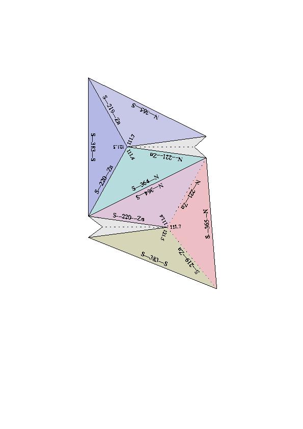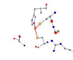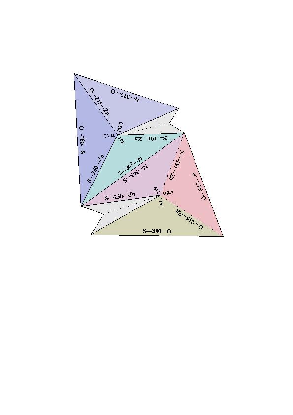 Horse liver alcohol dehydrogenase is an NAD-dependent enzyme. It is a dimer, and therefore, contains two identical subunits. This enzyme is very versatile. It works on a large number of alcohols and aldehydes, especially primary and secondary alcohols. The substrate binds to the enzyme at a hydrophilic pocket with the oxygen becoming a ligand to the zinc.2 (This situation was not shown in the crystal structure.) This zinc center is surrounded by two histidine groups (attached through a nitrogen) and a cysteine group (attached through a sulfur). The average bond distance is 220 pm, and the average peak angle is 115°. A planar center would have the peak angles equal to 120°. This is the "flattest" pyramid in this study.