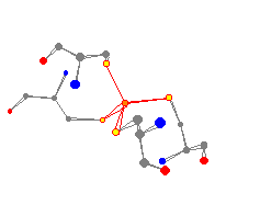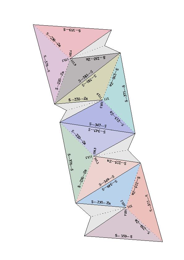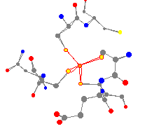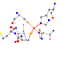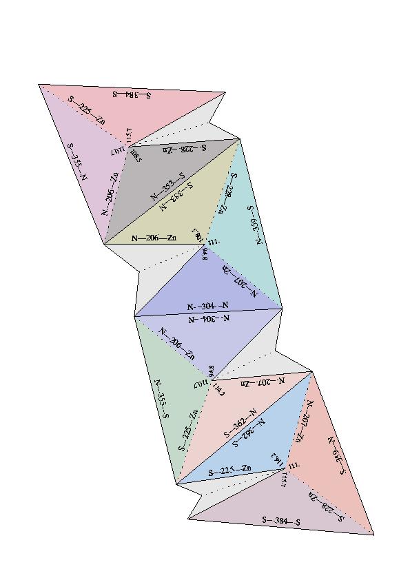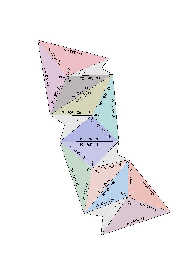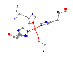 important because of its slow release properties after injection.3 The geometry of this center is interesting because it has two "short" bonds to nitrogens (174 and 196 pm) and two "long" bonds, one to a nitrogen (218 pm) and one to an oxygen (216 pm). This is likely due to the large nature of one of the chains (starting with a histidine) extending from the zinc, causing a lengthening in the two bonds to compensate for the crowding.
