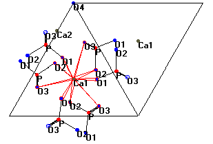 The six PO4 units of the unit cell (three in each of the two triangular subcells) are organized in sets of three in a "pinwheel" fashion around Ca1. They are attached via O2 and O3 in each case. In this depiction there are two O3 atoms aligned vertically. One is part of the enantiomeric CaO9 unit just above this one. | ![]() |