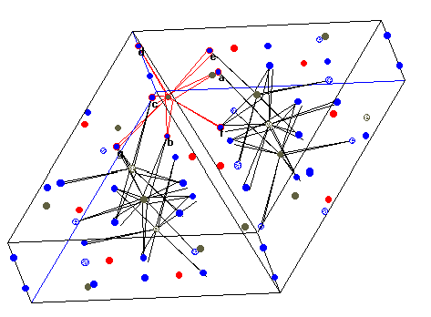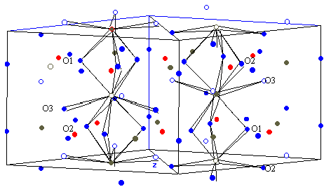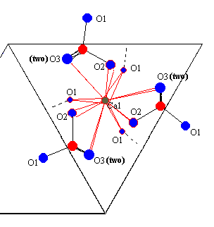 Along each of the three vertical faces of each triangular subcell there are two calcium atoms of another sort (Ca2), each with seven O atoms nearby, making a CaO7 substructure. Thus, each subcell contains 3(2)(1/2) = 3 Ca2 atoms, and the unit cell has six Ca2. Along with the four Ca1 atoms, this gives a total of ten calcium atoms in the unit cell.