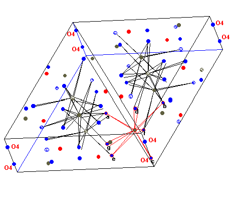 This next figure shows the other CaO7 unit on the central triangular face of the unit cell. Note how there are on each vertical edge two special O atoms (O4). In each triangular subcell we have six of these O4 atoms shared among six triangular subcells each. There is, in effect, one of these O4 atoms per subcell (two per unit cell). These special positions are OH groups in hydroxyapatite and F groups in fluoroapatite. (The H atom of the OH is randomly distributed among different locations in hydroxyapatite.)