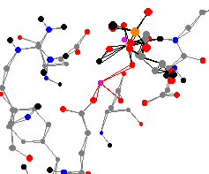 High concentrations make it less active.1 This zinc center has three oxygen atoms attached to it from a glutamic acid, an aspartic acid, and 2,5-anhydroglucitol-1,6-biphosphate. The average bond length is 235 pm. This center is less planar than the other two centers on the page, with the average angle at the peak of the pyramid being 101°.