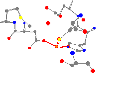This zinc center is surrounded by two histidine groups (attached through a nitrogen) and a cysteine group (attached through a sulfur). The average bond distance is 220 pm, and the average peak angle is 115°. A planar center would have the peak angles equal to 120°. This is the "flattest" pyramid in this study.