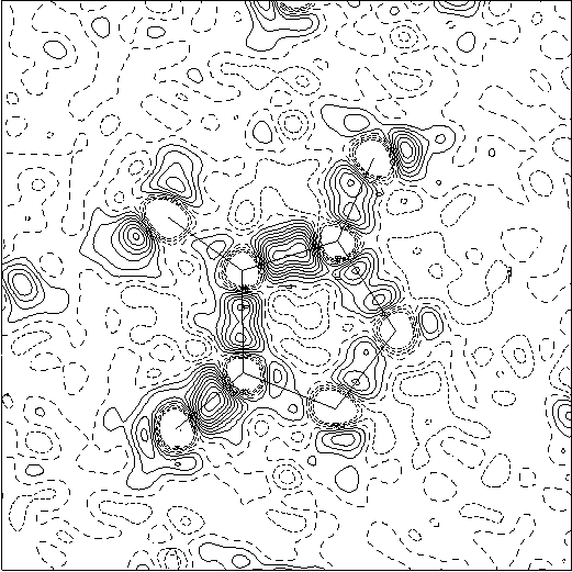 When X-rays are beamed at the crystal, electrons diffract the X-rays, which causes a diffraction pattern. Using the mathematical Fourier transform these patterns can converted into electron density maps. These maps show contour lines of electron density. Since electrons more or less surround atoms uniformly, it is possible to determine where atoms are located. Unfortunately since hydrogen has only one electron, it is difficult to map hydrogens. To get a three dimensional picture, the crystal is rotated while a computerized detector produces two dimensional electron density maps for each angle of rotation. The third dimension comes from comparing the rotation of the crystal with the series of images. Computer programs use this method to come up with three dimensional spatial coordinates.