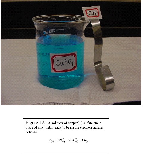 Figure 1A. A solution of copper(II) sulfate and a piece of zinc metal ready to begin the electron-transfer reaction.