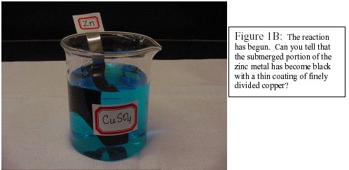 Figure 1B. The reaction has begun. Can you tell that the submerged portion of the zinc metal has become black with a thin coating of finely divided copper?