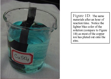 Figure 1D. The same materials after an hour of reaction time. Notice the lighter blue color of the solution (compare to Figure 1B) as most of the copper ion has plated out onto the zinc.