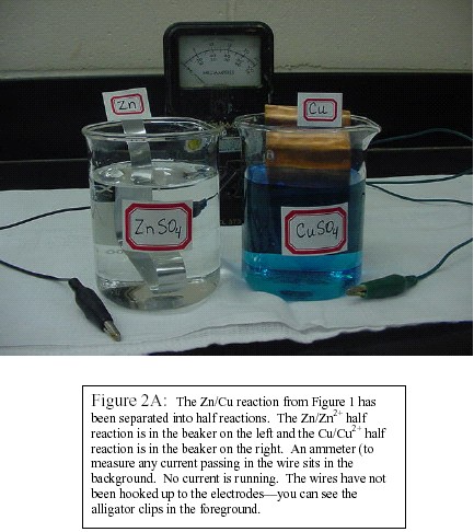 Figure 2A. The Zn/Cu reaction from Figure 1 has been separated into half reactions. The Zn/Zn2+ half reaction is in the beaker on the left and the Cu/Cu2+ half reaction is in the beaker on the right. An ammeter (to measure any current passing in the wire sits in the background. No current is running. The wires have not been hooked up to the electrodes—you can see the alligator clips in the foreground.