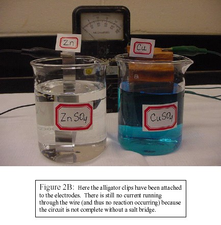 Figure 2B. Here the alligator clips have been attached to the electrodes. There is still no current running through the wire (and thus no reaction occurring) because the circuit is not complete without a salt bridge.