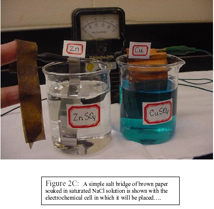 Figure 2C. A simple salt bridge of brown paper soaked in saturated NaCl solution is shown with the electrochemical cell in which it will be placed....