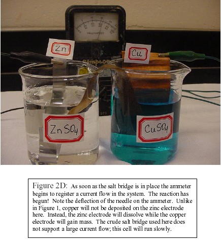 Figure 2D. As soon as the salt bridge is in place the ammeter begins to register a current flow in the system. The reaction has begun! Note the deflection of the needle on the ammeter. Unlike in Figure 1, copper will not be deposited on the zinc electrode here. Instead, the zinc electrode will dissolve while the copper electrode will gain mass. The crude salt bridge used here does not support a large current flow; this cell will run slowly.