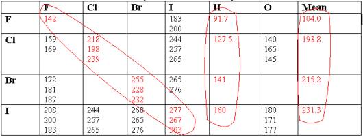 We selected the halogen column and had the database display only the molecules with halogens in the center. Then we looked clicked view, and looked at all the molecules, recording a few representative bond lengths in the table we constructed.
