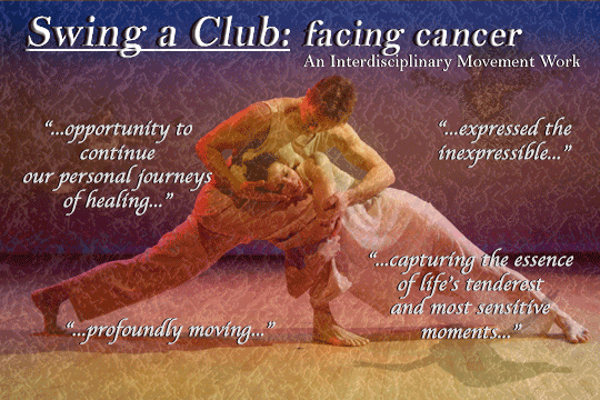 * I would like to extend my deepest thanks to Dona Werner Freeman, who so generously and skillfully played the role of the psychotherapist during the first two seasons of Swing a Club: facing cancer. Dona's friendship, artistry and life experiences made the creation and performance of the work all the more meaningful for me. ** I remember being especially impressed with a certain audience member who attended both the April and November performances and post performance discussions of Swing a Club at St. Olaf College. Her observations, comments and questions was sensitive, incite and engaging. It turns out this audience member was Billi Faillettaz, the newest addition to the cast of Swing a Club. I would like to warmly welcome Billi to the cast as she assumes the role of the psychotherapist for the Spring 2005 tours. Her debut in the work will be during the Bloomington, Minnesota performances March 18-19, 2005. |