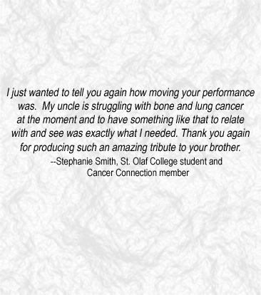 Performances of Swing a Club: facing cancer are not planned beyond the 2005-06 season. If you are interested in having Swing a Club: facing cancer performed in your area, please contact Anthony Roberts: awr@stolaf.edu / 507-786-3622.