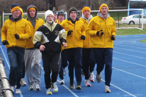 | David Wee '61, who remains an active runner, leads a ceremonial lap after Augustana's David Wee 5000 Meter Race was named in his honor. |