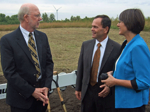 | St. Olaf President David R. Anderson '74 talks with Tim and Marian McKone, parents of James McKone '08, after the groundbreaking ceremony for the Mayo facility that will be located on St. Olaf property near the hospital. Tim McKone will be the radiation oncologist at the new facility when it opens next summer. |