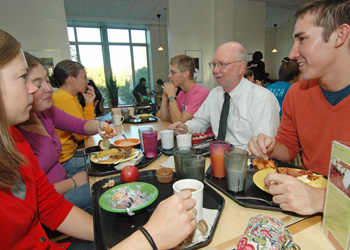 | President Anderson meets informally with student leaders (l-r) Samantha Sickbert '11, Kimberly Spitzfaden '11, and Eric Sheforgen '11 every month. |