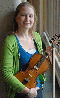 | “It has a nice sound,” says Meg Granum '11 of the Hardanger fiddle that's on loan from relatives in Norway. “Generally, the older the fiddle is, the better it sounds.” |