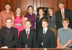 | The St. Olaf Mock Trial Team in Memphis: (front row, L-R) Nathaniel Brengle '10, David Aron '12, Nolan Franti '12, Steven Wilfong '11; (second row, L-R) Jonathan Henn '12, Katherine Burggraaf '12, Brenna Robinson '10, Justine Goeke '10, Josephine LaBua '12, Peter Engstrand '12. |