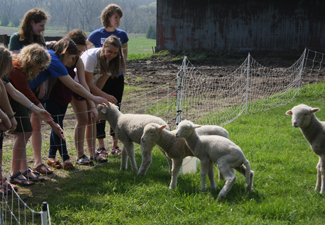 | Students in Elizabeth Hoover's Community Agriculture and Local Food Movements course get an up-close look at the livestock at Spring Wind Farm near Northfield. |