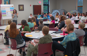 | St. Olaf Associate Professor of Political Science Kathy Tegtmeyer Pak kicks off a presentation to community members in Faribault. |