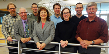 | Faculty members who will be involved in the Beckman Scholars Program at St. Olaf include (from left) Associate Professor of Biology and Environmental Studies John Schade, Associate Dean for Natural Sciences and Mathematics Matt Richey, Professor of Biology and Environmental Studies Charles Umbanhowar Jr., Professor of Chemistry and CURI Director Mary Walczak, Associate Professor of Chemistry Doug Beussman '92, Assistant Professor of Biology and Chemistry Laura Listenberger, Associate Professor of Chemistry Jeff Schwinefus, Professor of Biology Eric Cole, and Associate Professor of Biology Steve Freedberg (not pictured). |