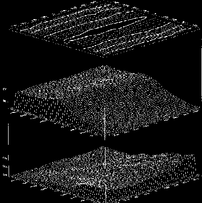 The contours in the upper panel represent the surface topography of a 10 Km square region centered on the summit (see our satellite image). The lower mesh surface is bedrock topography as determined from surface-based ice-penetrating radar measurements. Between these is a mesh surface depiction of one of the more prominent internal layers produced by radar reflections from (probably volcanic) debris. This layer is interesting because it depicts the strain field within the ice, and it thus contains information about both the accumulation history in the area as well as ice dynamics. |
