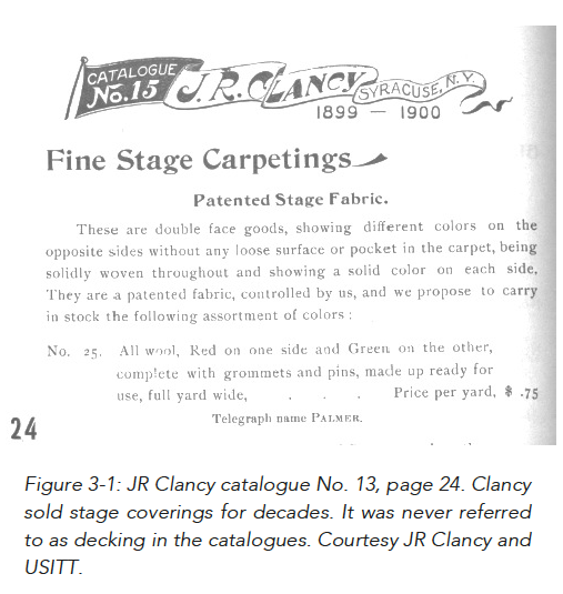 If we visit the catalogue of JR Clancy for 1899-1900 we find the product category of ‘stage carpeting’.