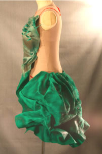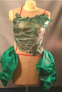The first step in the process was to cut a piece of wonderflex large enough for the breastplate and the bustle. I formed the breastplate out of wonderflex once I'd heated it sufficiently using the techniques above. I used straight pins to hold the wonderflex in place and maintain its shape. Once the wonderflex cooled down it was set in the shape that I wanted. I used needle nose pliers to remove the straight pins. Although the straight pins left small holes, I was able to hide them in the folds and wrinkles of the breastplate. I worked the bustle in much the same process as the breastplate. I formed the shape of the bustle on a dress form that I had placed three panniers around. I gradually would heat the material, form the shape, and then let it cool down before moving on around the mannequin. I eventually achieved the look I was aiming for. With the bustle I wanted to achieve a flower petal-like shell. That was all that it took to make the foundation of my costume. Once the hardened wonderflex based shape was created, I used an airbrush to paint highlights and shadows. The final step was setting in grommets that would allow the costume to be tied onto an actress. The costume was finished.