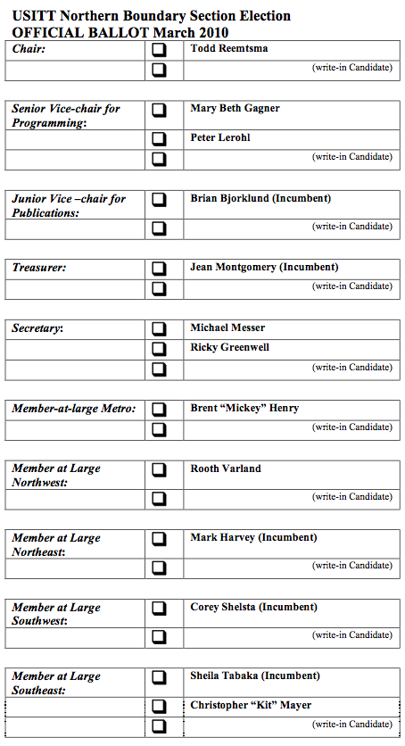 Its election time! The Northern Boundary Section nominating committee has prepared a slate of candidates for our leadership positions and they are listed below. A ballot including these nominees as well as space for write-in candidates will be handed out at our annual meeting in Kansas City at the USITT National Conference. That meeting is scheduled for 8am on Thursday, April 1. If you will will not be attending that meeting, click here for an absentee ballot.