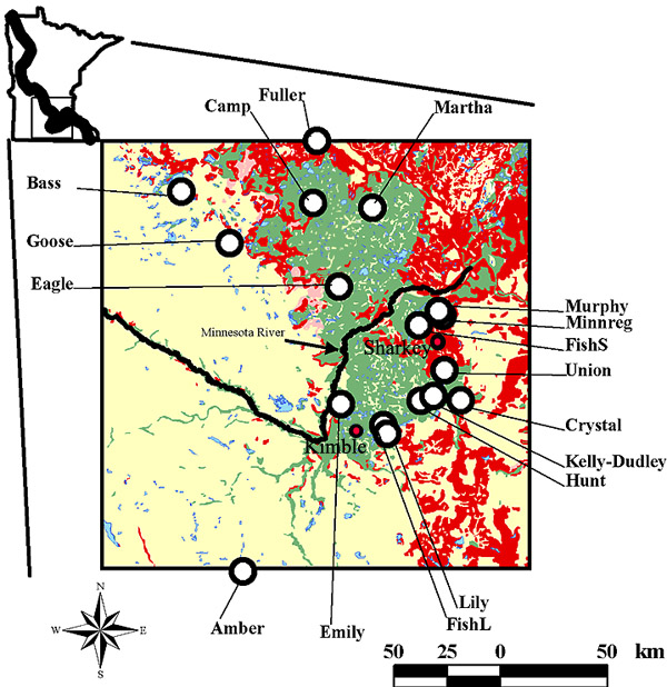The Bigwoods were a large area of deciduous forest surrounded by prairie that occupied much of south-central Minnesota . The existence of this tongue of forest surrounded by prairie -- and its associated fires -- has caused much discussion since the 19th century. |