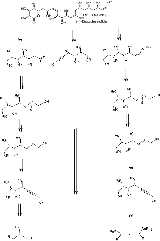 The main purpose of this investigation was to assemble the subunits of the polypropionate immunosuppressive agent (+)-discodermolide. This highly active natural product has been the target molecule for many synthetic studies. This particular study hopes to synthesize the three fragments of this homochiral compound, (+)-Discodermolide. In this approach, key stereocenters are introduced through additions of chiral allenylmetal reagents to the readily available aldehyde (S)-2-metheyl-3-silyoxypropanal. Subsequent reduction of the triple bond in regioselective expoxide cleavage with hydride or methyl cuprate provides the subunits of (+)-discodermolide. (+)-Discodermolide is a competitive inhibitor for the mitotic cycle. This study uses Sharpless epoxidation because it insures a selective oxidation in synthesis, providing a homochiral compounds or a nonracemic mixture. Thus, it’s an asymmetric epoxidation. The two separate schemes the researchers came up with allow this to happen. Each scheme creates a subunit of the compound having separate chiralities. One scheme is comprised of a certain segment of the product with a different chirality than the second scheme. The Sharpless Epoxidation was used for each scheme because it helps create specific stereochemistry. The epoxide stereochemistry as stated earlier produces a high yield of a non-racemic mixture thus the product remains uncontaminated.