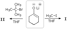 34 The lithium enolate base from cyclohexanone reacts with alkyl halides, often in different ways. As shown here, methyl iodide and tert-butyl bromide react to give different organic products, I and II, together with lithium halides. What are the products from these reactions? A) I is 2-methylcyclohexanone; II is 2-t-butylcyclohexanone B) I is 1-methoxycyclohexene; II is 1-t-butoxycyclohexene C) I is 2-methylcyclohexanone; II is 1-t-butoxycyclohexene D) I is 2-methylcyclohexanone; II is a mixture of cyclohexanone and 2-methylpropene