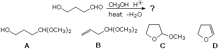55 What donor and acceptor reactants should be used to prepare the following compound by an aldol reaction? A) acceptor = formaldehyde; donor = propanedial B) acceptor = 1,3-propanediol; donor = ethanal C) acceptor = propanal; donor = formaldehyde D) acceptor = formaldehyde; donor = propanal