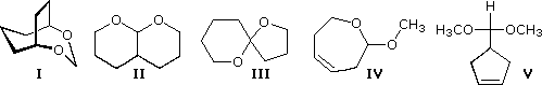 61 Which of the following compounds (I through V) should not be classified as an acetal? A) II & III B) IV C) I D) none (they are all acetals)