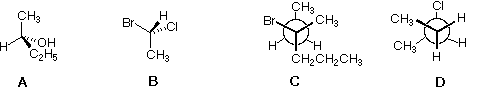 11 Consider the Fischer projection formula for (S)-2-chlorobutane Which of the following changes does not convert this structure to the (R)-enantiomer? A) rotation 180º in the plane of the paper (or screen) B) flipping the structure over (a 180º rotation out of the plane) C) exchanging the two vertical substituents (i.e. top and bottom) D) exchanging the two horizontal substituents (i.e. right and left)