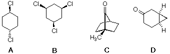 36 What common symmetry elements if any are found in the stable chair conformer of trans-1,4-dichlorocyclohexane? A) a single mirror plane and a C2 rotational axis. B) a C3 rotational axis but no mirror plane. C) two orthogonal mirror planes and a C2 rotational axis. D) a single C2 rotational axis but no mirror plane.