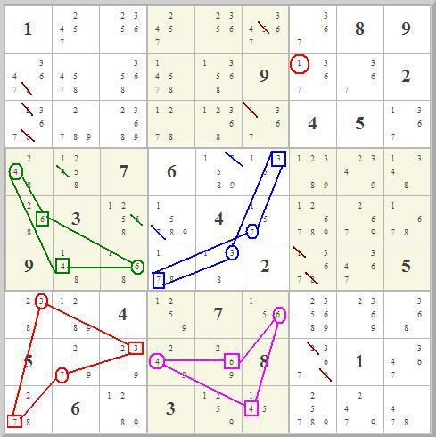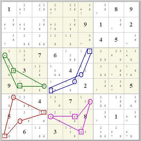 Note that this finding -- that exactly one of two possibilities must be X and the other must be Y -- is precisely the definition of a strong edge. (In a strong edge there are two mutually exclusive possibilities, one of which must be true. For example, a cell with only two possible values, or a row with only two occurrances of a given value.) What this analysis shows is that it is possible to create a strong Medusa chain that is itself not simply a collection of two-element strong edges. As far as we know, this is an unprecedented finding. It results in several important eliminations. Basically, we have four strong Medusa chains, one in each of the four blocks. When a Medusa chain has two nodes of the same value in the same block, then all other possibilities for that value can be discarded. In this case we get to eliminate r4c2#4. r5c3#6, r4c5#3, r5c4#7. OK, so that's progress! | ||